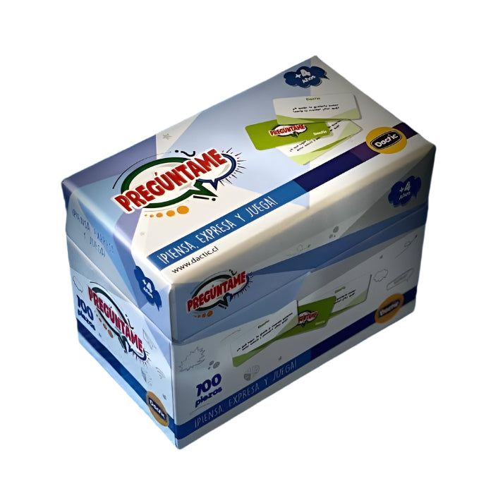 Este juego consiste en que los participantes deben acordar previamente el orden en que irán sacando las cartas para responder e iniciar una conversación sobre el tema en cuestión.Son 100 láminas que los motivarán a ser rápidos para contestar creativamente a cada pregunta.Contiene 100 láminas de 9 x 4,5 cm. aprox.
